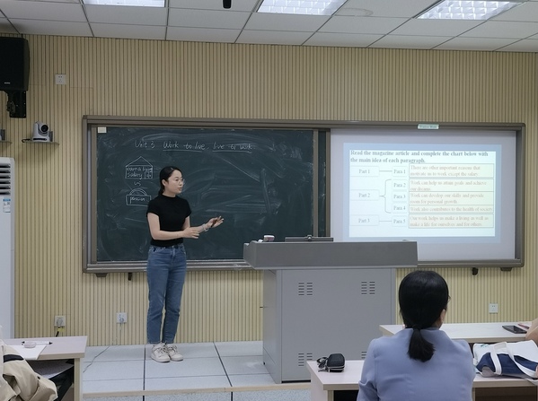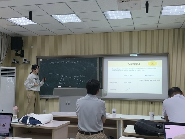 首先,由师范生基本功大赛的六名参赛选手依次上台展示十分钟模拟授课。然后,侍之春进行点评指导。他提出了许多值得思考深究的问题,例如导入课堂的活动是否适合,要考虑到心理学和教育学在课堂中的应用,避免课堂上板书的书写错误,以及课堂用语的表达准确性等等问题,为她们未来的教学水平的提升指引了方向。随后陈珺向参赛选手们展示了十分钟的同主题课堂模拟。陈珺的授课紧扣大赛要求、过程流畅、环环相扣。他巧妙地将语言点融入语篇分析中去,通过一个又一个问题引导学生思考,让学生自己说出答案,充分体现了以学生为主体的课堂。授课完毕,陈珺热情地为参赛选手介绍了自己授课的一些方法和辅助的工具,并为各位选手答疑解惑。活动最后,副院长于胜博再次鼓励各位选手只争朝夕,再创辉煌。