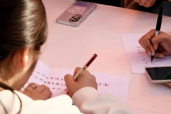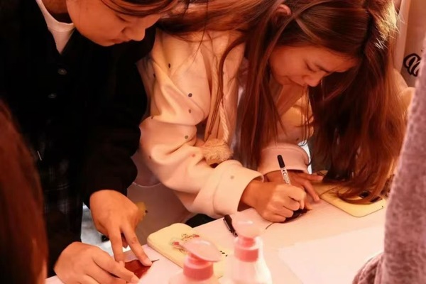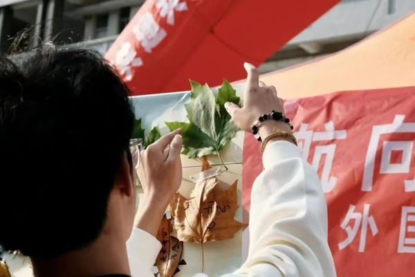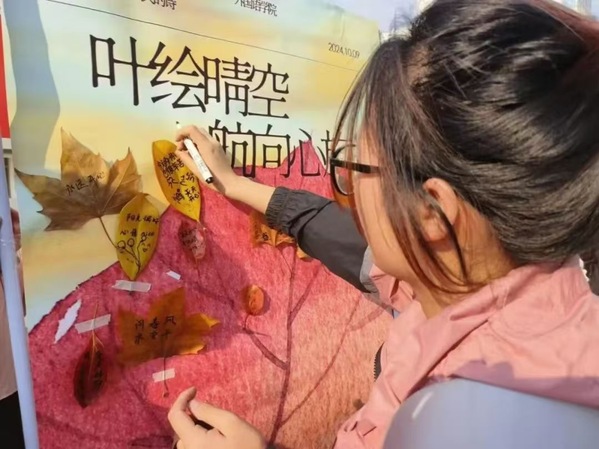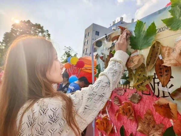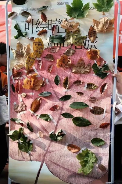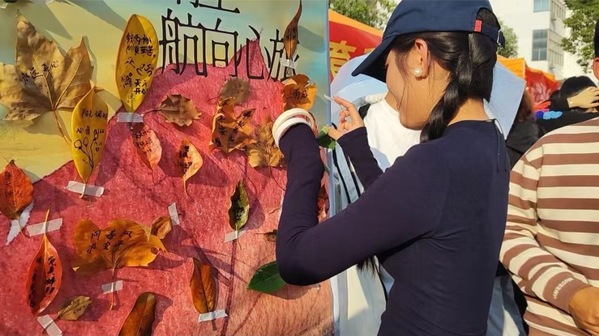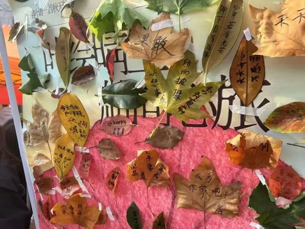 在“叶上绘心情”活动环节中,同学们被邀请用画笔和文字在落叶上描绘自己的心情。一片片落叶成为了同学们心灵的画布,他们或细腻地勾勒,或肆意地挥洒,将自己的情绪与感受融入其中。落叶上绘满了心灵的色彩,或象征内心的愉悦与轻松,或表达内心的思考与沉淀。同学们还在落叶上写下了简短的心情文字,将它们固定在展板上,分享近期的感悟与收获。这一活动让同学们在创作中促进了彼此之间的情感交流,找到心灵的慰藉。