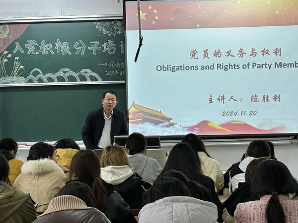 不忘初心、牢记使命。为进一步加强对入党积极分子的思想政治教育,帮助他们深入理解党的权利与义务,坚定其入党信念,11月20日下午3点,william英国官网于8号楼301教室开展入党积极分子培训。本次培训由陈胜利教授主讲,2024秋学期入党积极分子参与培训。