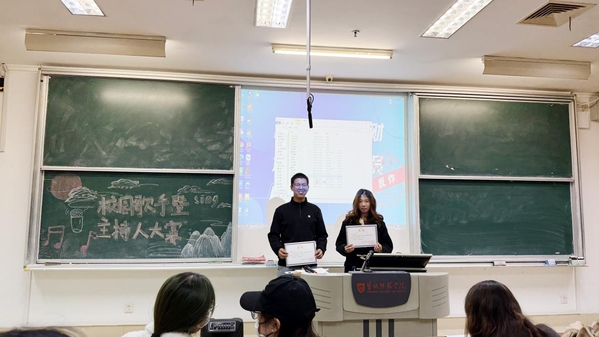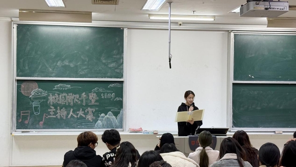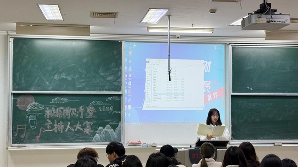 接下来是校园歌手大赛,决赛现场上,12名演唱选手纷纷拿出自己的拿手金曲,给观众带来一场精彩绝伦的视听盛宴。比赛开始,各位选手依次上台亮相,《九张机》、《不为谁而作的歌》、《How far I’ll go》等歌曲。选手们在舞台上尽情发挥,将感情融入歌声,时而轻柔婉转,时而激昂高亢。选手们声入人心,博得现场观众连连叫好,整个教室被热烈而激动的氛围填满。这里是赛场,更是青春的舞台。