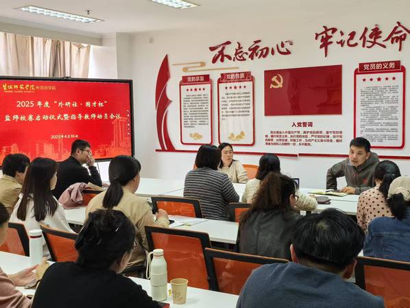 2024年度,我校学子表现优异,共斩获国家银奖1项、省级奖项16项。为做好2025年度赛事准备工作,4月16日下午,我院在教学主楼13楼西会议室召开赛事启动会暨指导老师动员会。会议由副院长周海明主持,他在会上强调:要充分发挥团队合作精神、各赛项负责人要统筹规划、全体指导教师要群策群力。我院始终将该赛事作为:人才培养的重要平台、专业建设的品牌项目、教学成果的展示窗口。此次动员会的召开,标志这我校2025年度“外研社·国才杯”大赛备战工作全面启动。所有指导教师将以更加饱满的热情和专业准备,力争在2025年度各赛项中再创佳绩。