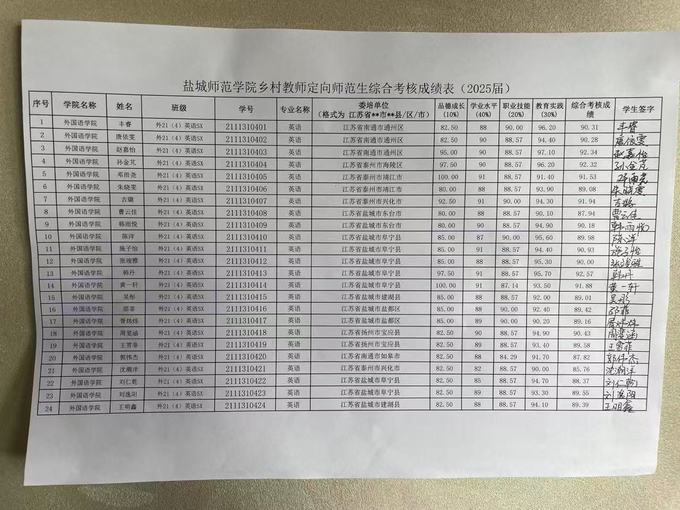 根据《WilliamHill威廉希尔乡村教师定向生综合考核成绩计算方法实施细则》,william英国官网对所有乡村教师定向生进行了综合评定,考核结果由学生本人逐条核对,签字确认无异议后进行公示: