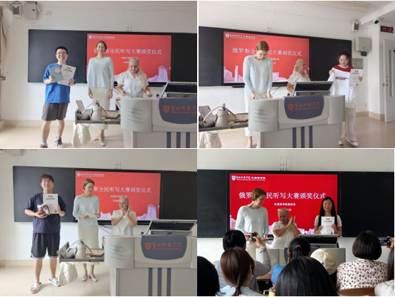 颁奖仪式上,为获奖学生准备了丰富的奖品,包括俄罗斯文学经典著作——普希金、屠格涅夫、托尔斯泰、高尔基等文学巨匠的作品,以及精美的俄语日历、俄罗斯巧克力和特色文化衫等。外教维多利亚和伊琳娜为获奖者颁发证书和奖品,并向他们表达了诚挚的祝贺,鼓励同学们继续努力学习俄语,深入了解俄罗斯文化,为中俄文化交流贡献力量。
