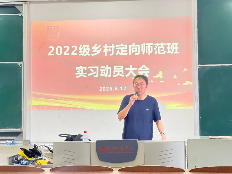 为扎实推进教育实习工作,提升师范生实践能力,2025年6月17日下午,我院在教学主楼B103教室组织召开了2022级英语(乡村定向)师范生教育实习动员大会。英语教育系主任杨丹、副主任刘岩出席会议,2022级全体39名乡村定向师范生参加会议。