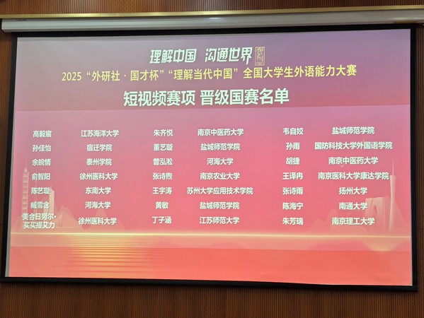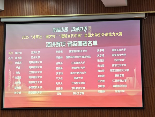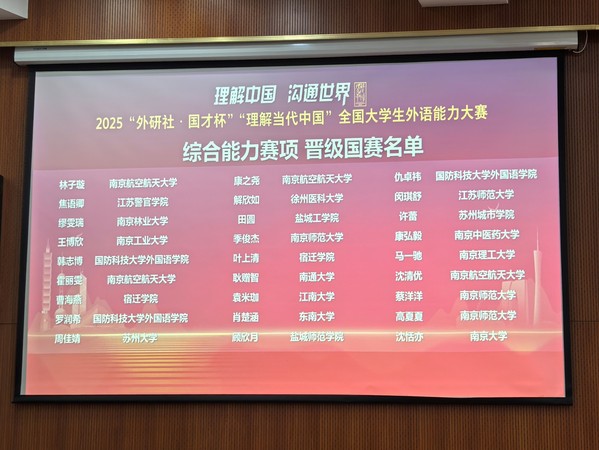 在2025“外研社·国才杯”“理解当代中国”全国大学生外语能力大赛江苏赛区选拔赛中,我院统筹指导的我校学子奋勇争先、再创佳绩,以历史最好成绩彰显我校外语人才培养的综合实力。